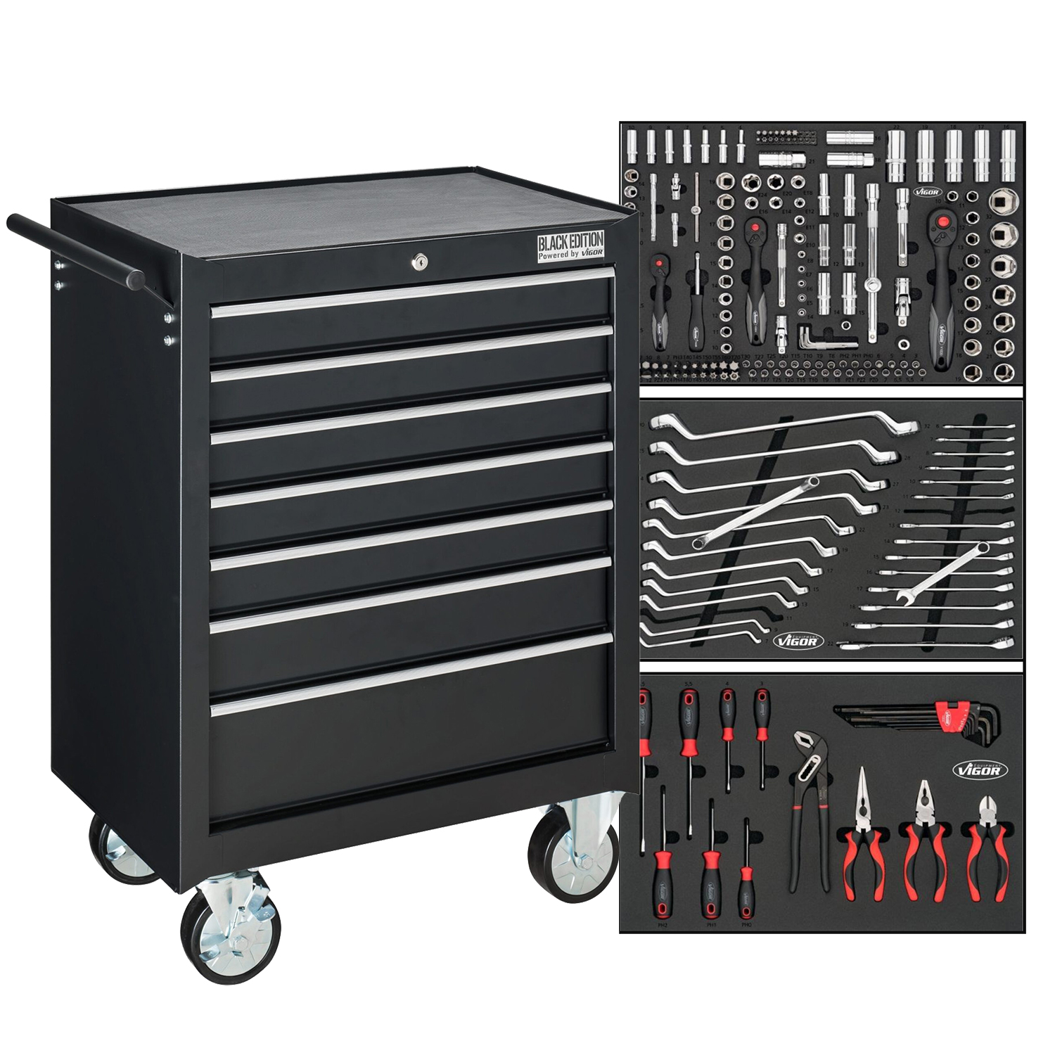 Profesionalna radionička kolica VIGOR Black Edition sa 7 fioka i setom od 211 komada alata – idealna za servis, radionicu i zahtevne korisnike. Robustne konstrukcije, centralno zaključavanje i kvalitetan alat u organizovanom ulošku.