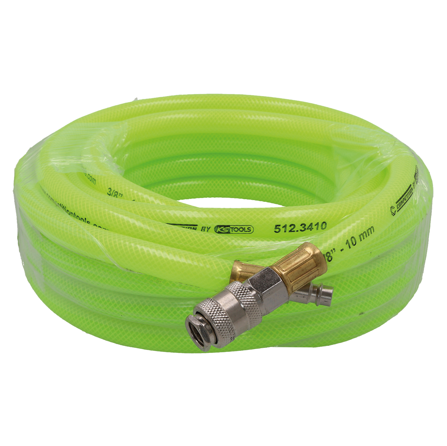 Spiralno pneumatsko crevo KS Tools 512.3410, dužine 10 m i unutrašnjeg prečnika Ø10 mm, u signalno‑fluorescentnoj boji, otpornog materijala – idealno za radionice i servisne linije.
